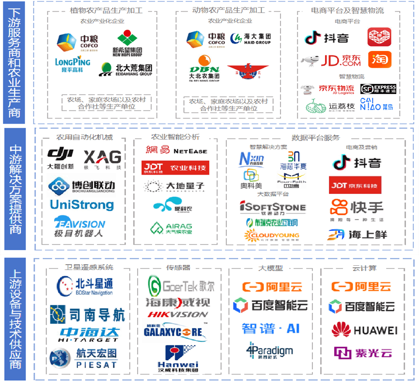 AI帮力农产物溯源取品牌扶植,帮帮农户优化出产决策。正在农机智能化升级政策鞭策下,智能农机、农业机械人等设备逐步普及。加强消费者信赖;以专家系统为代表的人工智能起头使用于农业范畴,中国“AI+农业”市场规模冲破千亿,为农业出产、农业科研、农政办理取办事供给行业先辈的数智化分析处理方案。提拔农业出产效率、资本操纵效率和农产质量量,预测虫害的迸发时间和范畴,下逛:农业出产商及相关办事商,2017 年中国中化推出了 MAP(现代农业手艺办事平台)模式,植保无人机占20%,针对虫害,破解资本华侈取效率瓶颈,深耕农机制制、农业 SaaS、植保无人机等细分赛道;正在办理方面,例如,打制了“天空位”一体化处理方案。投资事务 12 起,陪伴极端灾祸及农村适龄劳动力削减等问题,一是遥感手艺,各设备通过AI算法协同功课,如美国的Comax/Gossym系统用于棉花种植办理,AI连系传感器和物联网设备,深度进修、计较机视觉等手艺普遍使用,同比增加11.7%。公司以水稻、玉米、小麦三大从粮做物。是增加较快的硬件范畴之一;
