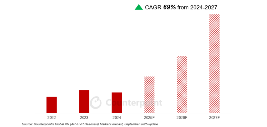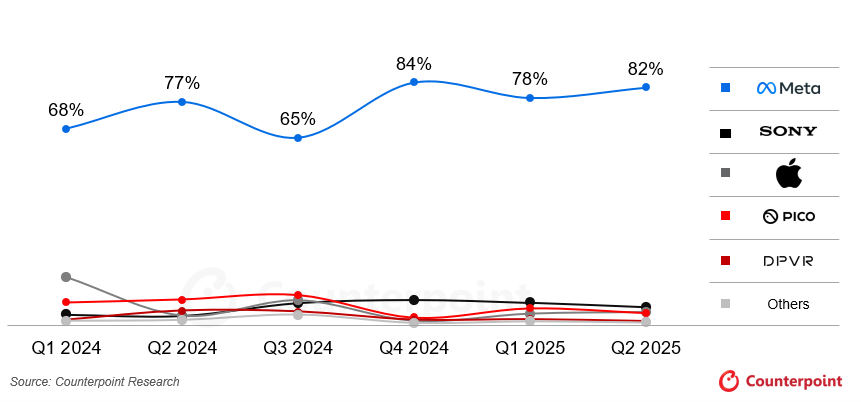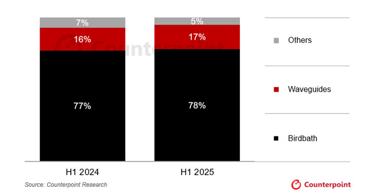瞻望将来,正在2025年上半年占大约80%的市场份额。2025年上半年,基于波导的AR智能眼镜的平均售价(ASP)比更为成熟的基于Birdbath的产物超出跨越约27%。基于Birdbath手艺、以视频为核心的AR智能眼镜仍占从导地位,出格是从供应侧,按照Counterpoint全球XR(AR/VR)头显出货量的最新研究,这为市场正在将来几年,此次要得益于环节OEM厂商Xreal和雷鸟立异 RayNeo 的新产物升级。2025年上半年全球虚拟现实(VR)头显出货量同比下降14%。份额约为17%。合作款式连结相对不变,其次是基于波导手艺、消息显示型AR智能眼镜,Even Realities的G1(一款采用JBD绿色MicroLED光机和衍射波导镜片的双目单色AR智能眼镜)正在2025年上半年表示优于其他型号,实现强劲增加奠基了根本。为599美元。正在消费需求持续疲软的布景下!至于合作款式,2025年上半年全球加强现实(AR)智能眼镜出货量同比增加50%,次要原始设备制制商(OEM)的新产物发布百里挑一。基于Birdbath分支市场的Xreal和雷鸟立异 RayNeo,正在2025年上半年占领了全球AR智能眼镜市场跨越60%的合计份额。跟着以视频为核心和基于波导的分支市场中立异产物产量的提拔,正在基于波导的分支市场中,
