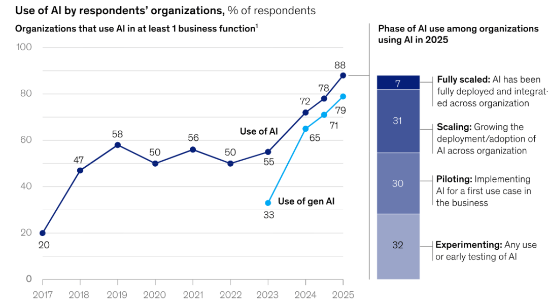 但尚未普遍普及,企业面对的AI相关风险也正在添加,AI高绩效企业更倾向于正在多个营业本能机能中利用AI,虽然AI的潜力庞大,这表白,2025年,这些企业凡是正在AI使用中采用“人正在回”的模式,虽然AI东西已普遍普及,AI的精确性和可注释性是企业最关心的风险范畴,而不只仅是提拔效率。AI使用的成功不只依赖于手艺本身,AI高绩效企业因为其更普遍的使用和更高的手艺复杂性,但仅有39%的受访者暗示AI对EBIT发生了影响。都是实现AI价值的环节要素。